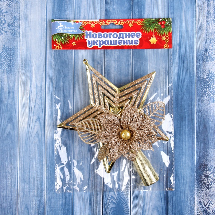 Объёмный золотой наконечник в форме цветка размером 18×14 см станет выразительным украшением верхушки ёлки. Его резной дизайн и наполненная структура сочетают элементы ар-деко и новогоднего барокко, подчёркивая изящество праздничного интерьера.