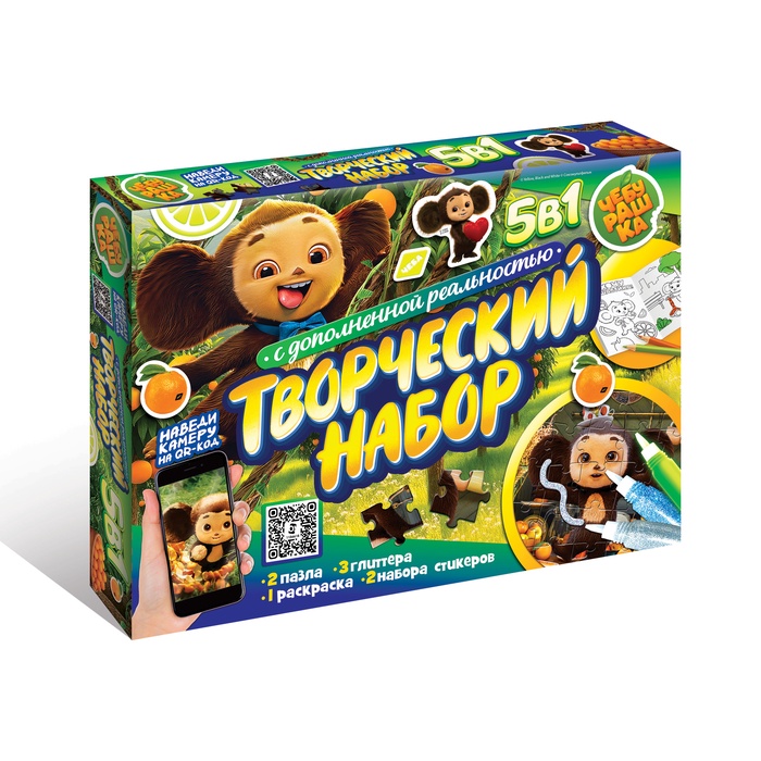 Набор пазлов для творчества «Чебурашка», 5в1: раскраска, пазлы, глиттеры, наборы стикеров
