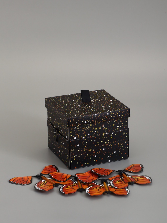 Коробка-сюрприз подарочная «Бабочки, Звезды» с вылетающими бабочками, чёрный, 15×14.8×12.5 см