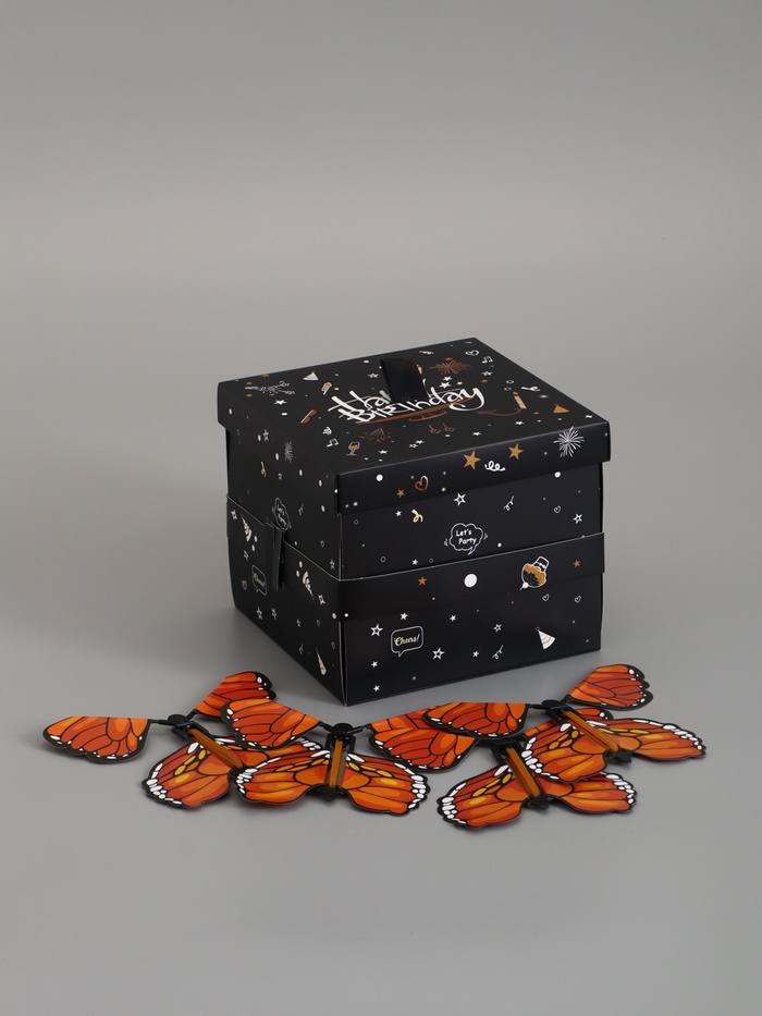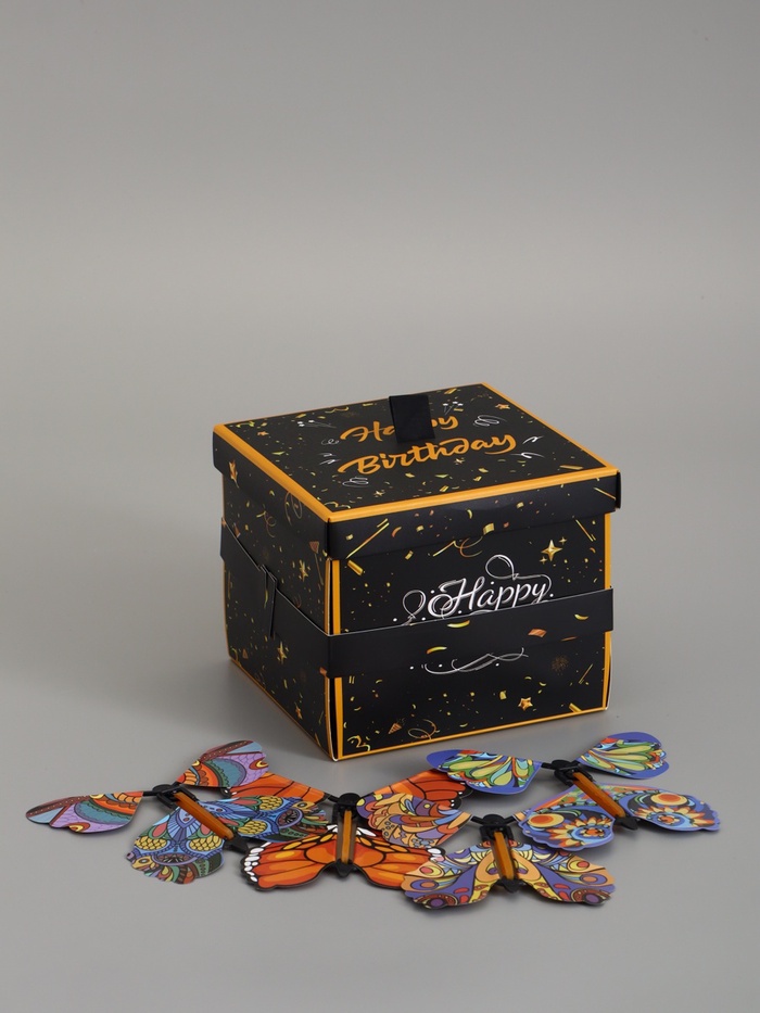 Коробка-сюрприз подарочная «Бабочки, День рождения» чёрная, с вылетающими бабочками, 15×14.8×12.5 см