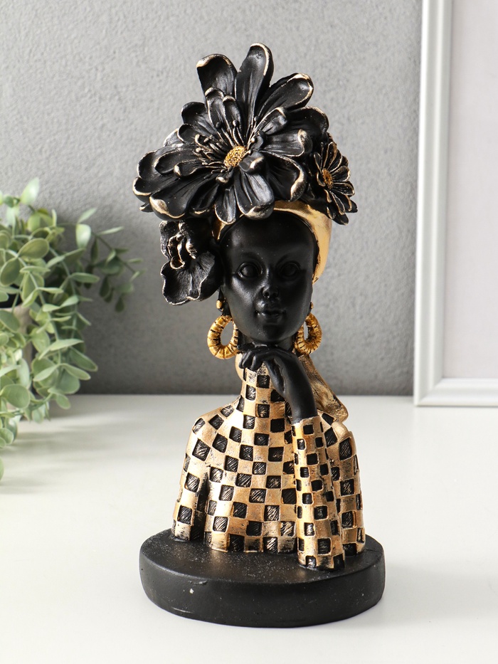 Бюст полистоун «Девушка с цветком, в наряде в клетку», чёрный, 13.3×12.3×29.5 см