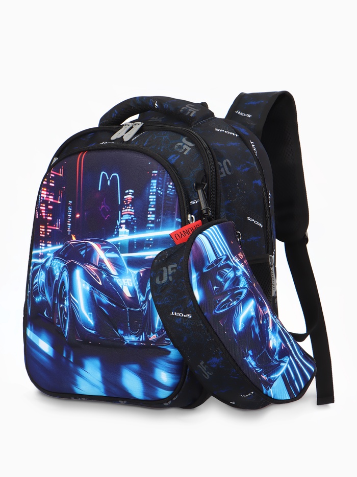 Рюкзак школ. с Эргон. спин. 28*16*36 см, +Пенал, мальчик, Машина, черный/синий
