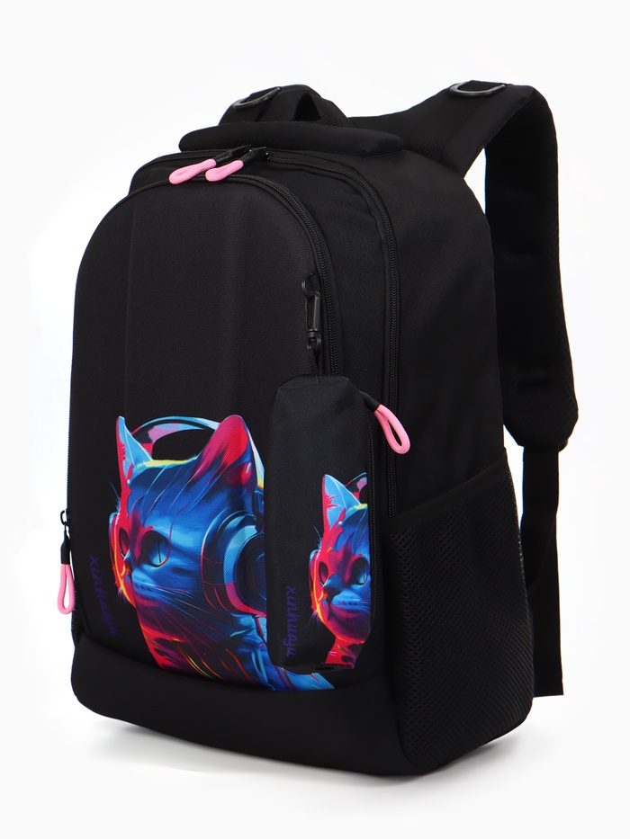 Рюкзак школ. с Эргон. спин. 32*17*41 см, +Пенал, девочка, Кот, черный