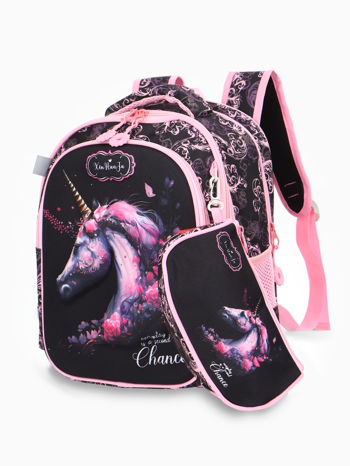 Рюкзак школ. с Эргон. спин. 28*18*36 см, +Пенал, девочка, Единорог, черн/роз