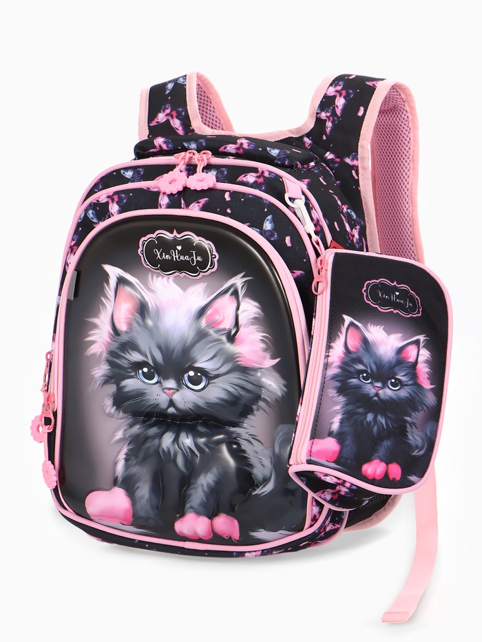 Рюкзак школьный «Кошечка», для девочки, с пеналом, эргономичная спинка, 29×14×38 см, чёрный, розовый