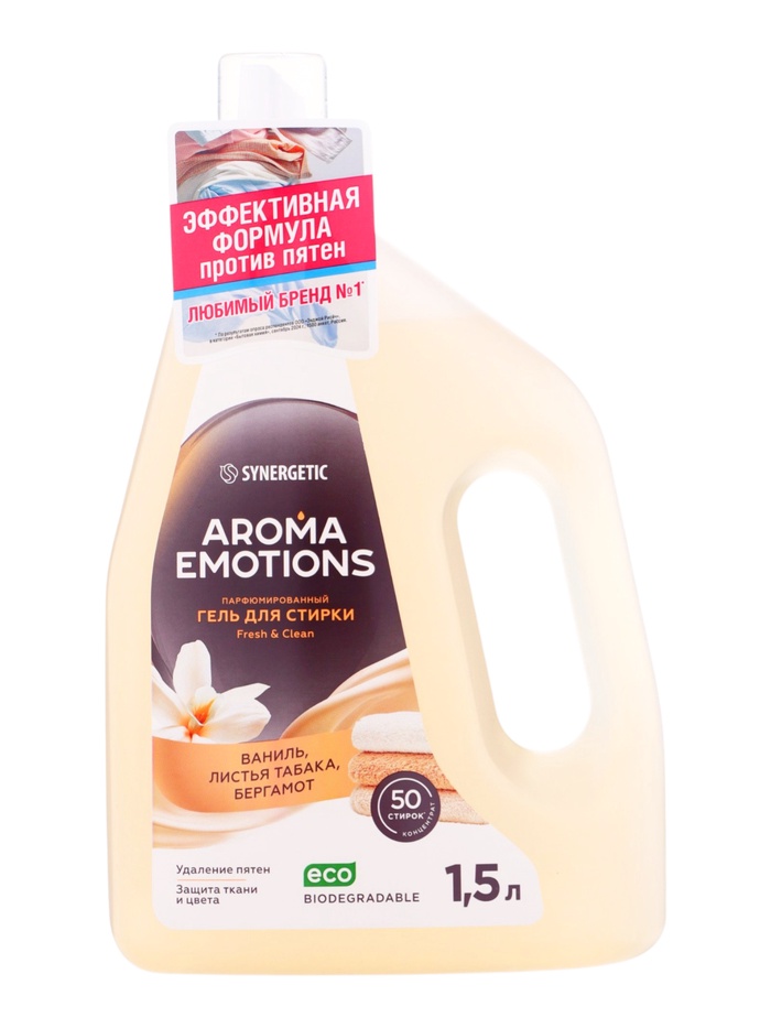 Гель для стирки белья парфюмированный SYNERGETIC ваниль, табак, бергамот, 1,5 л