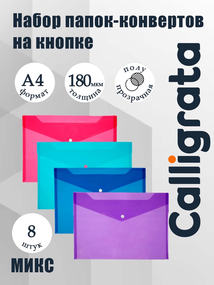 Набор 8 штук папки-конверты на кнопке, формат А4, 180мкр, 4 цвета