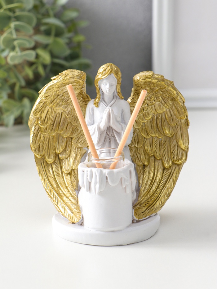 Аромадиффузор для эфирных масел с палочками «Ангел со свечой», полистоун, белый с золотом, 7.5×12×11 см