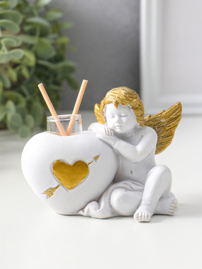 Аромадиффузор для эфирных масел с палочками «Ангел с сердцем», полистоун белый с золотом, 5.3×12×9 см
