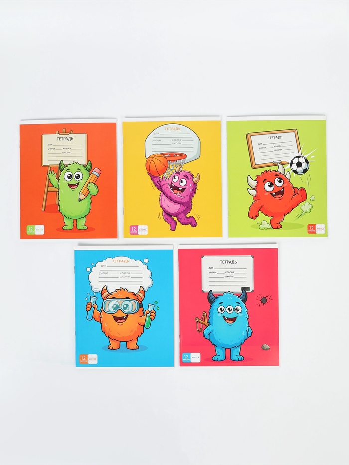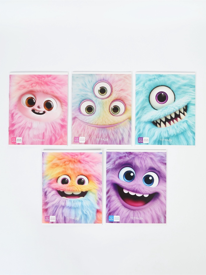 Тетрадь 12 листов в клетку, 5 видов МИКС "Монстрики"