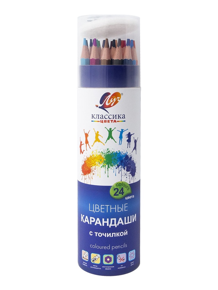 Карандаши 24 цветов, заточенные, шестигранные, с точилкой, дерево