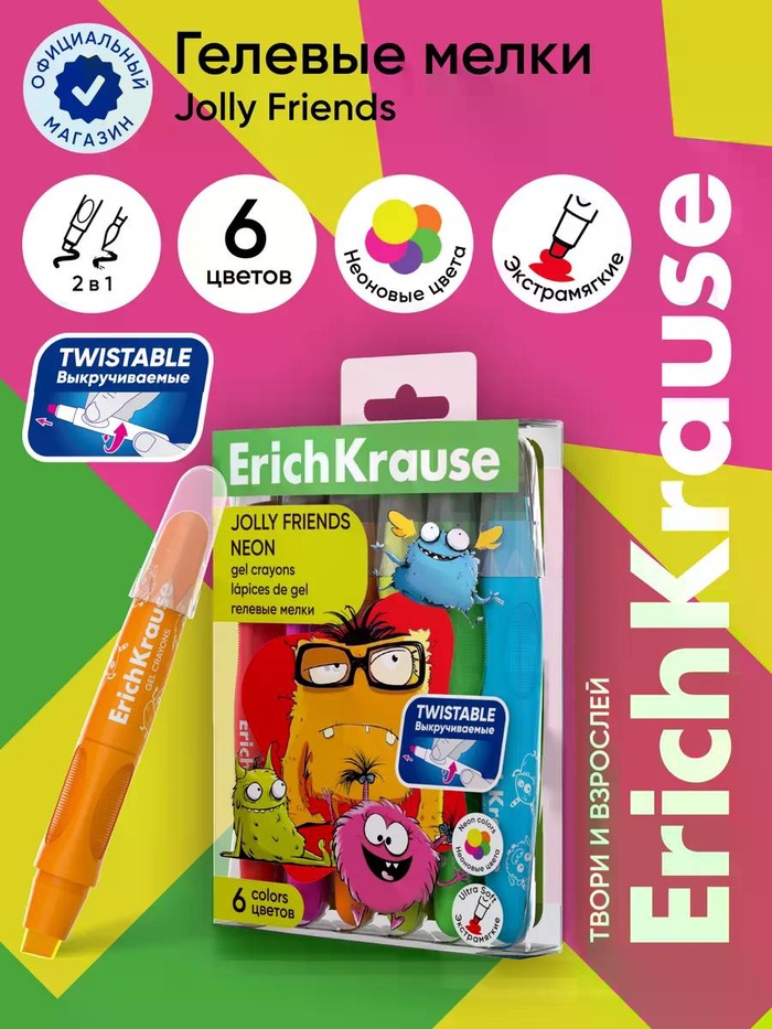 Гелевые мелки 6 цв ErichKrause Jolly Friends Neon, с европодвесом