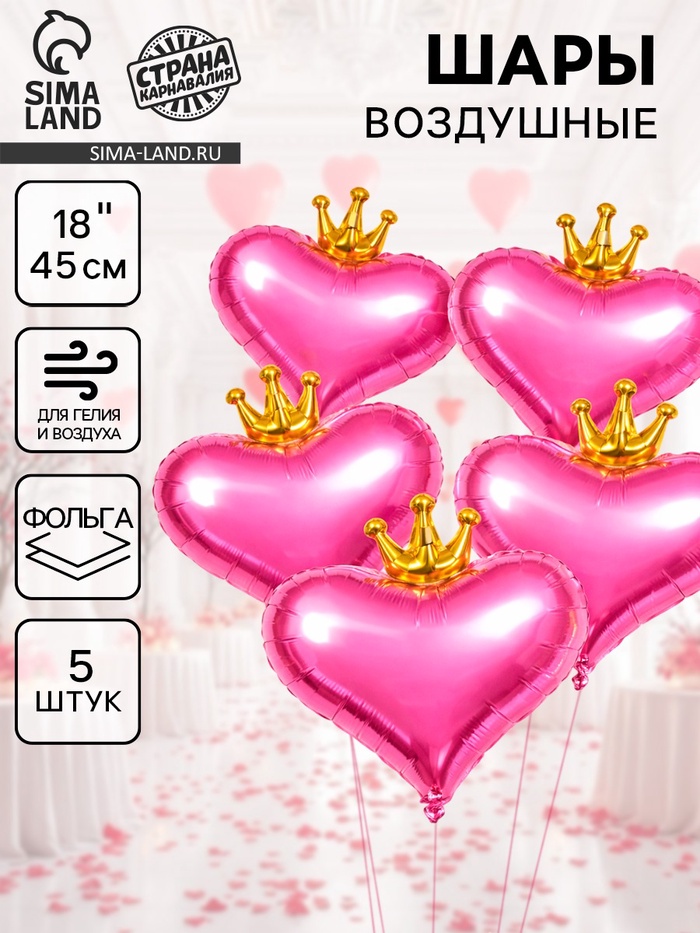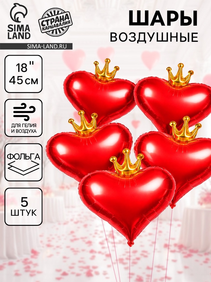 Воздушные шары фольгированные 18" «Сердце с короной», 5 шт.