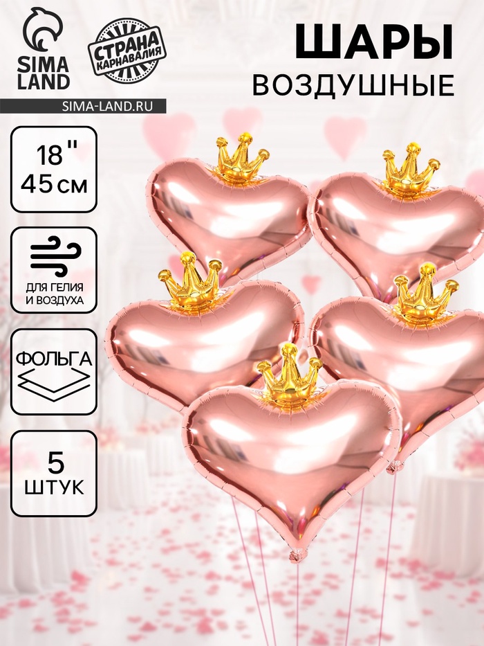 Воздушный шар фольгированный 18" «Сердце с короной», набор 5 шт., розовое - золото
