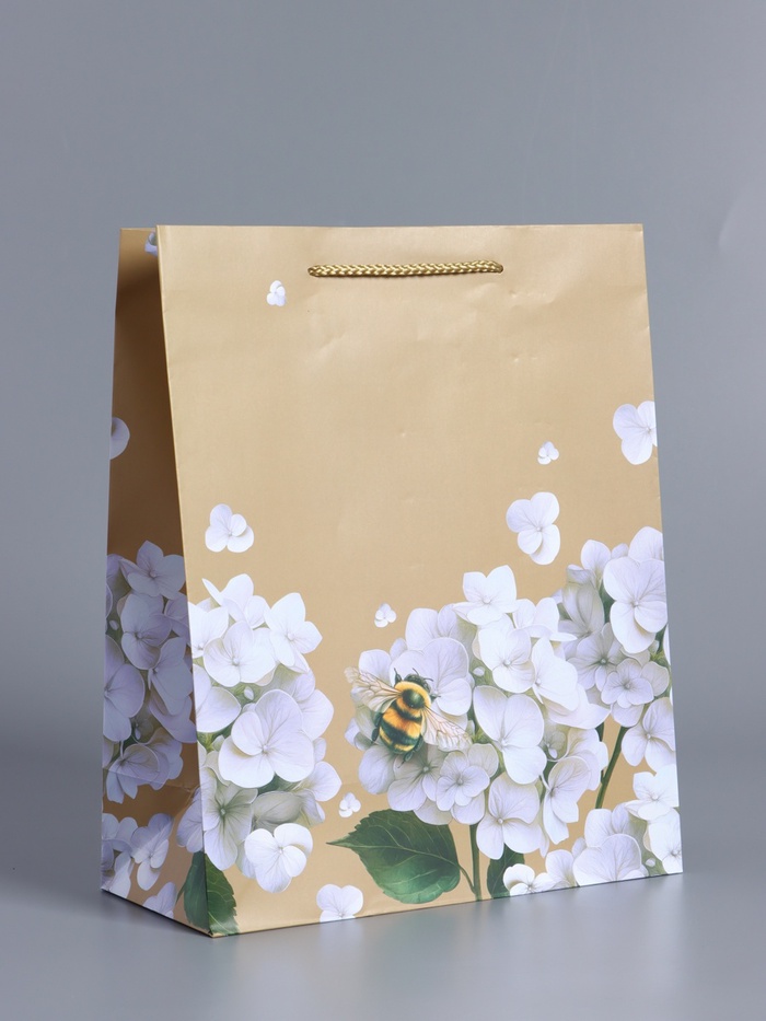 Пакет подарочный ламинированный «Пчёлка на гортензии», бежевый, 26×12×32 см