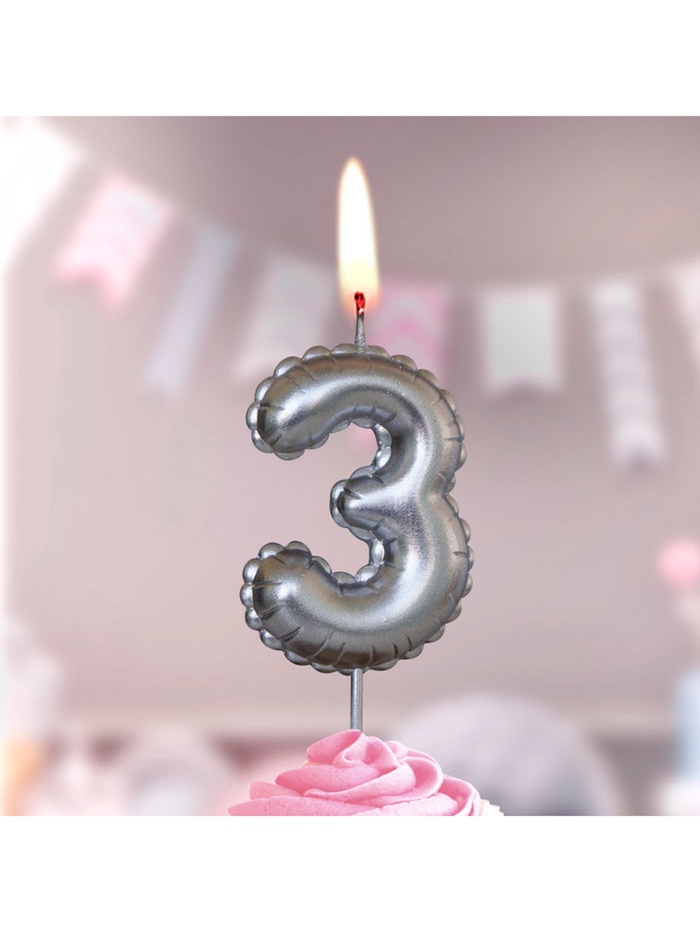 Свеча в торт на шпажке "Воздушая цифра", цифра "3", серебро