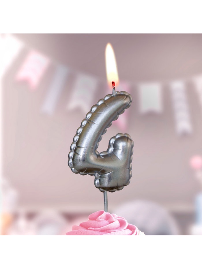 Свеча в торт на шпажке "Воздушая цифра", цифра "4", серебро