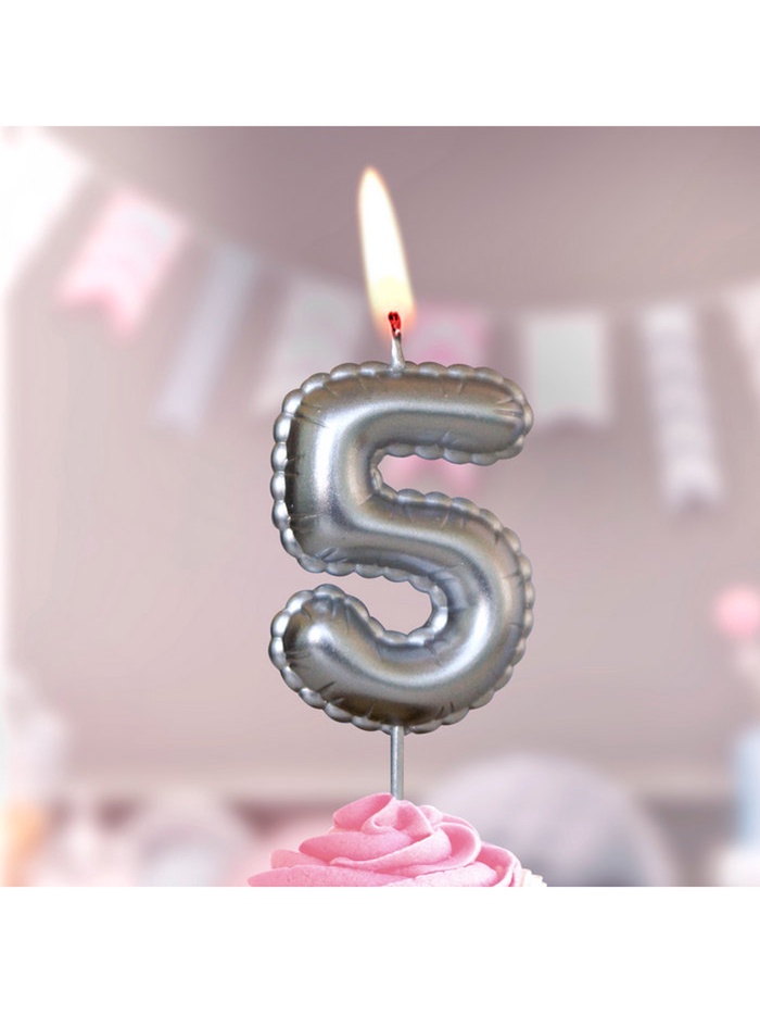 Свеча в торт на шпажке "Воздушая цифра", цифра "5", серебро