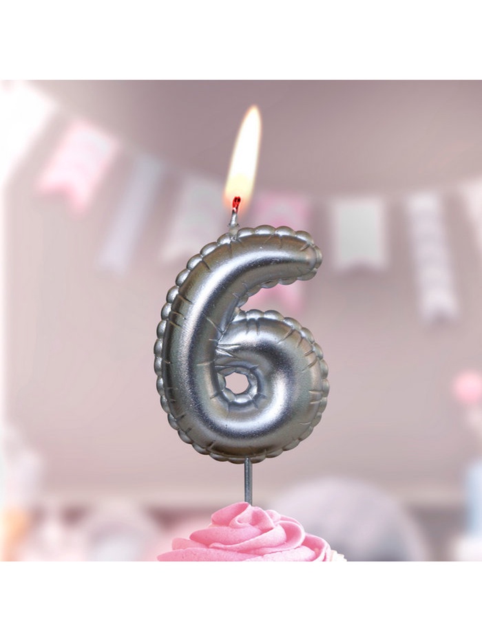 Свеча в торт на шпажке "Воздушая цифра", цифра "6", серебро