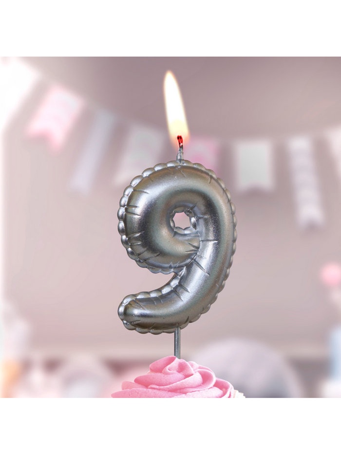 Свеча в торт на шпажке "Воздушая цифра", цифра "9", серебро