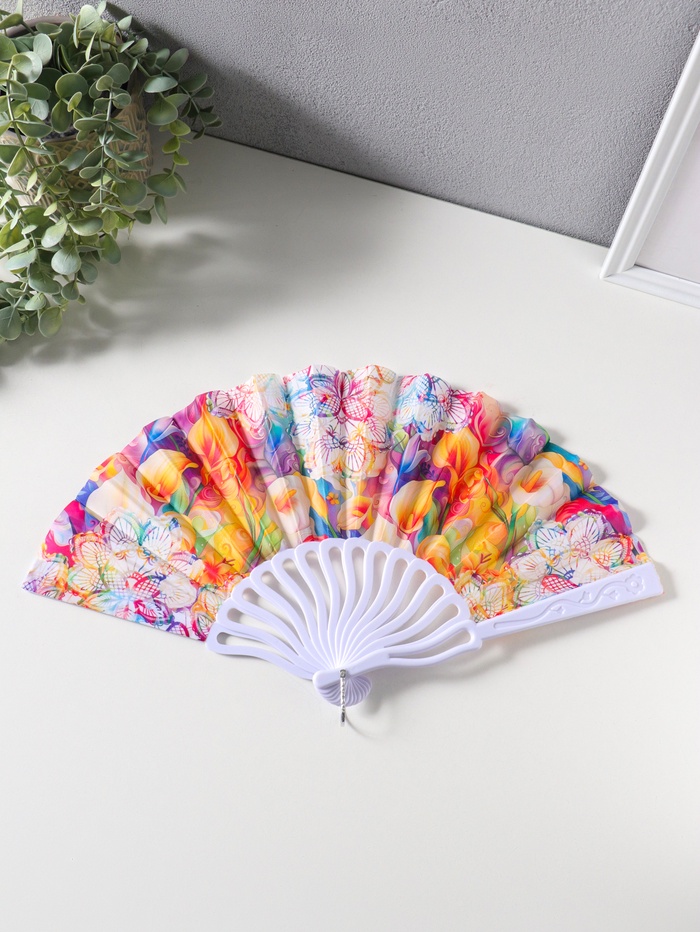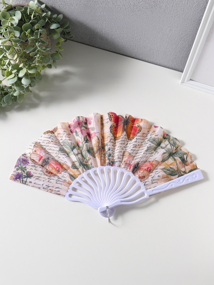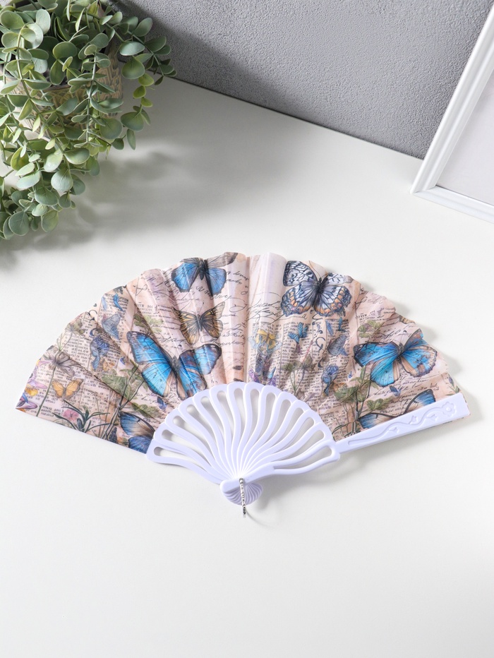 Веер пластик, текстиль "Бабочки, цветы и старые газеты" 22,5 см