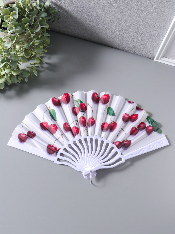 Веер пластик, текстиль "Вишенки на белом" 22,5 см