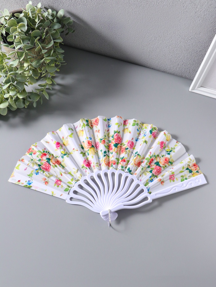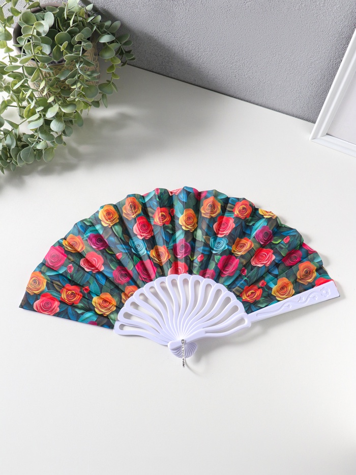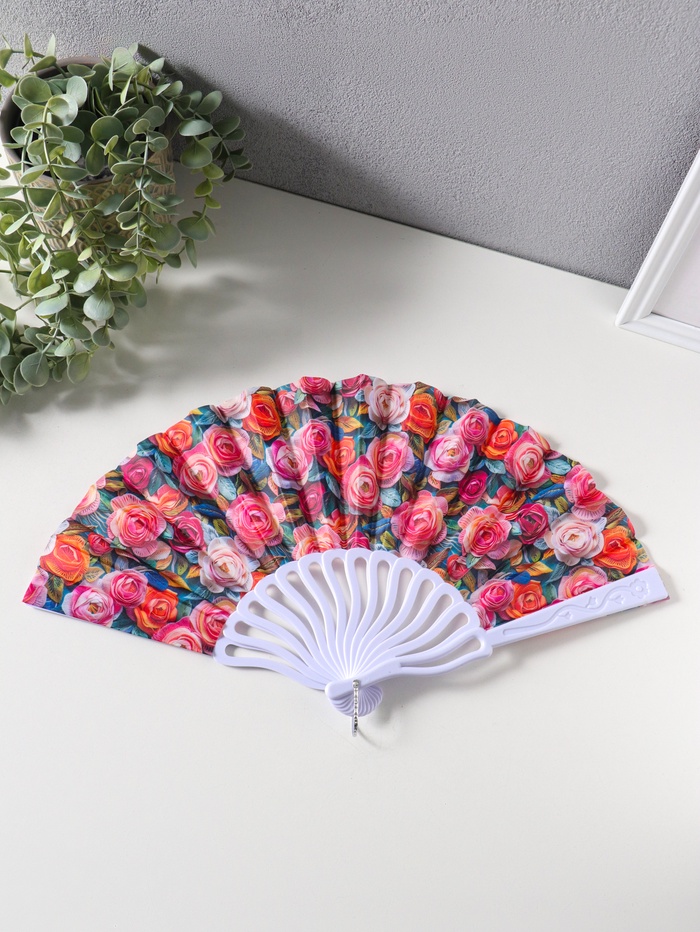 Веер пластик, текстиль "Кустовые розы" 22,5 см