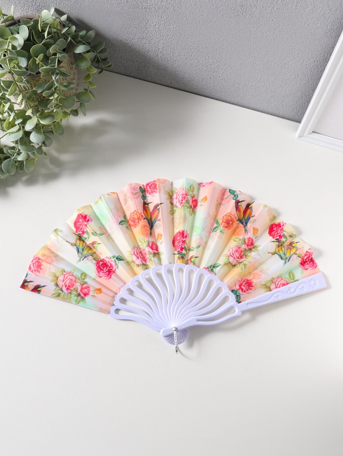 Веер пластик, текстиль "Розы и птицы" 22,5 см