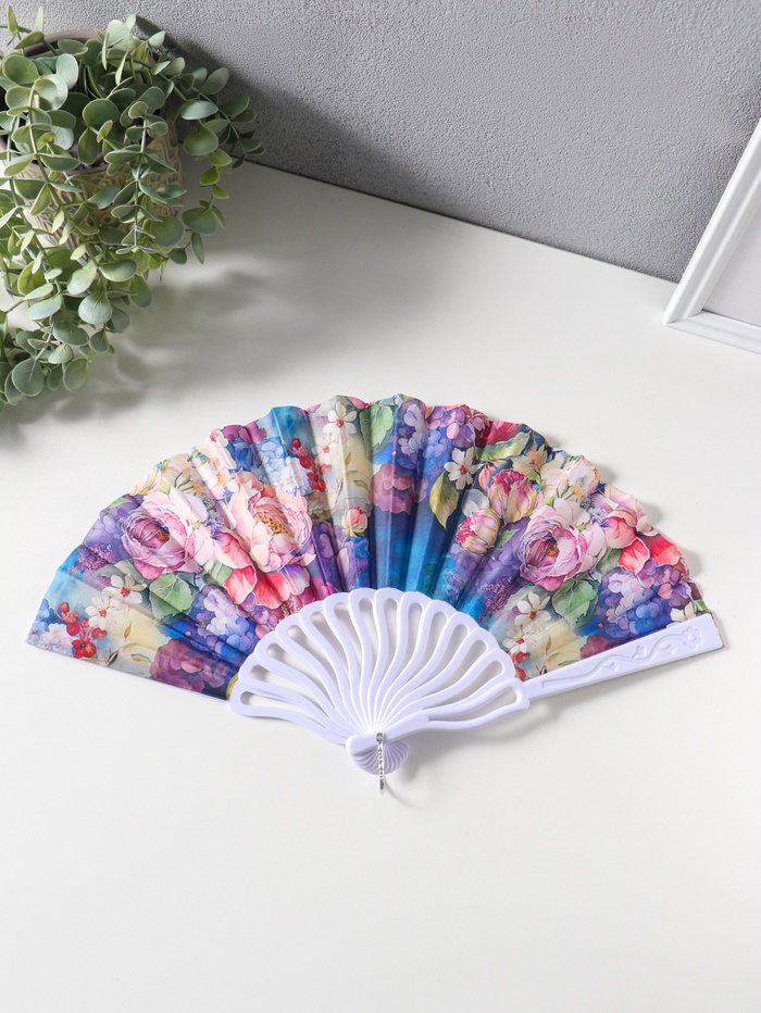 Веер пластик, текстиль "Пышные пионы и гортензии" 22,5 см