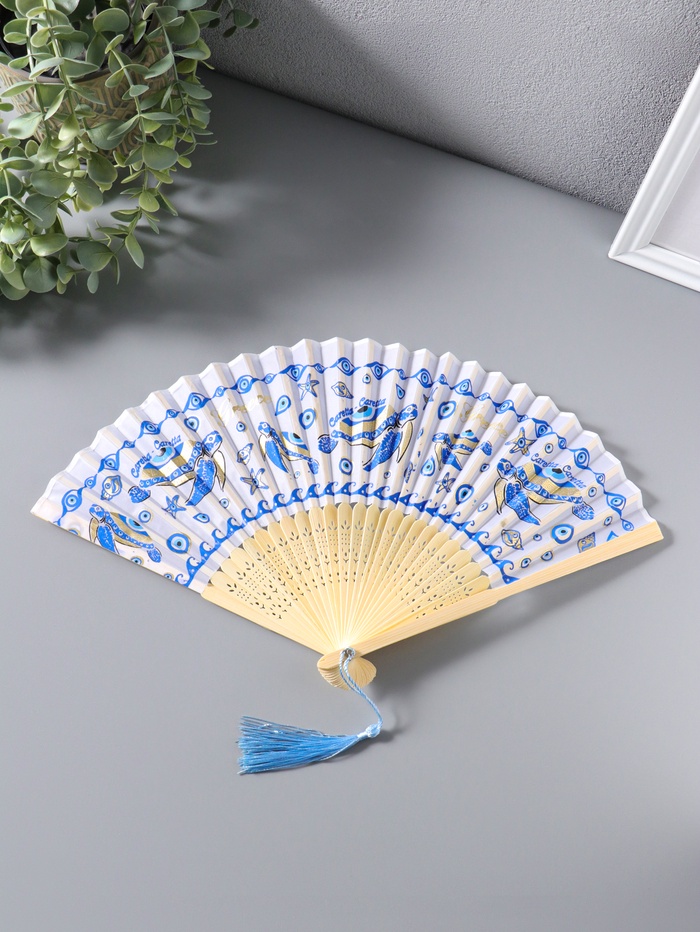 Веер дерево, текстиль с кисточкой "Черепахи" белый с золотом 23 см