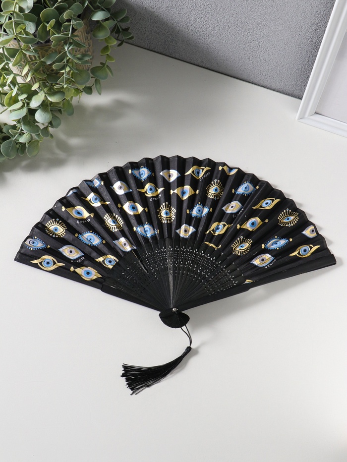 Веер дерево, текстиль с кисточкой "Глаза от сглаза" чёрный с золотом 23 см