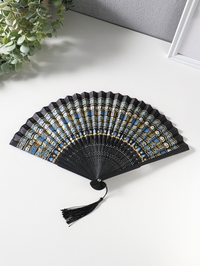 Веер дерево, текстиль с кисточкой "Греческий орнамент" чёрный с золотом 23 см