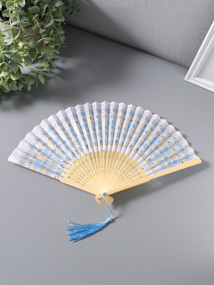 Веер дерево, текстиль с кисточкой "Греческий орнамент" белый с золотом 23 см