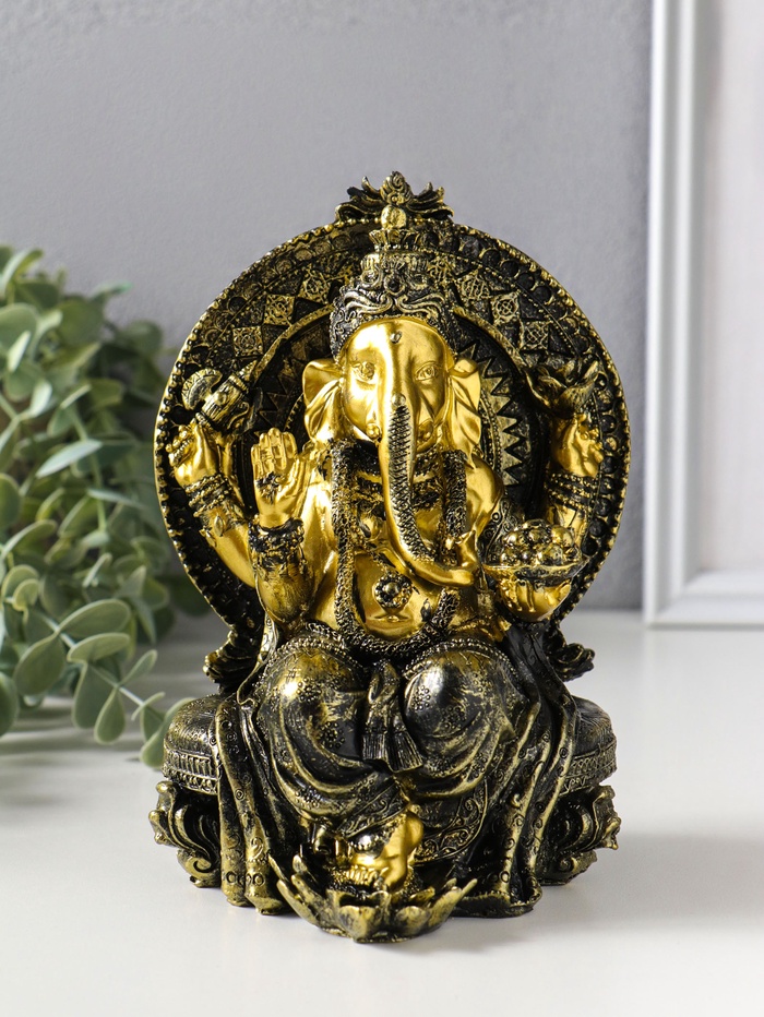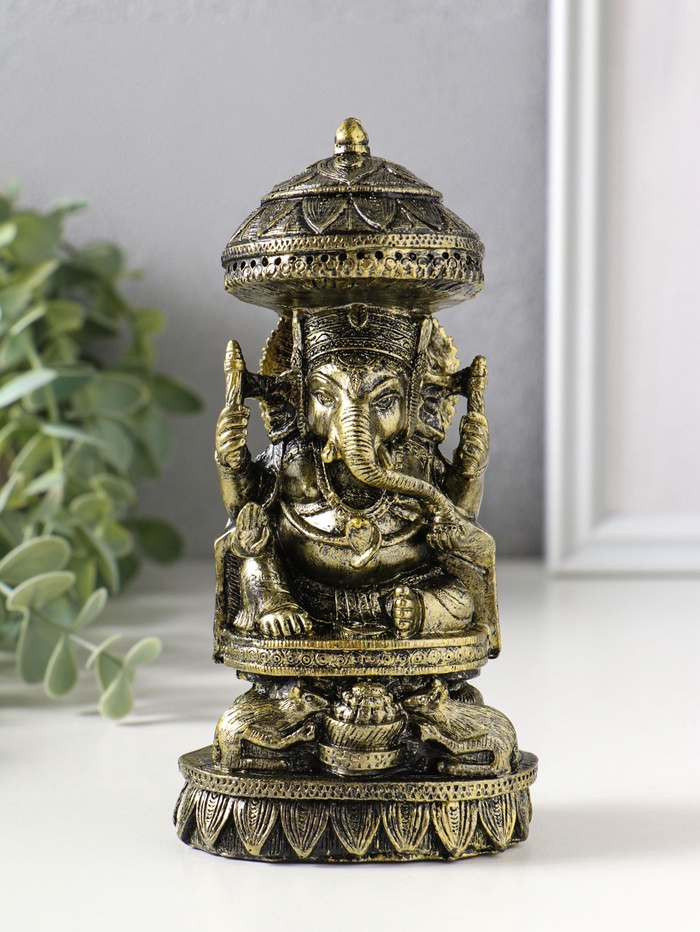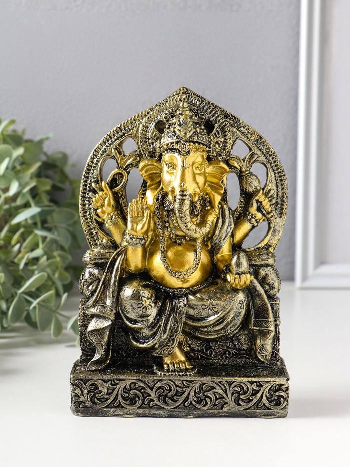 Сувенир полистоун "Ганеша на резном троне" золотая бронза 4х11,7х17,3 см