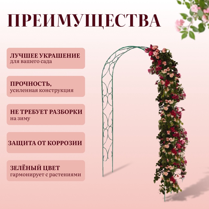 Лёгкая конструкция из металла выдерживает вес растений, устойчива к воздействию осадков и температуры. Под аркой не нужен фундамент, вы можете разбирать её и переносить по участку. От коррозии изделие защищает краска зелёного цвета, которая гармонирует с листьями.