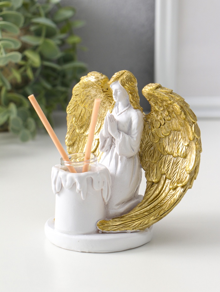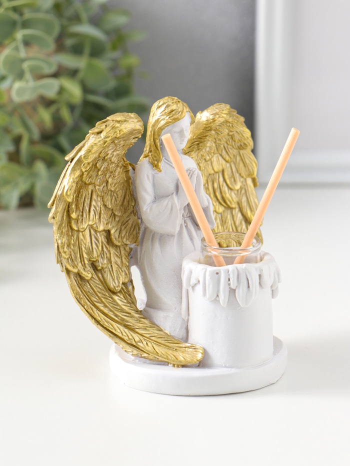 Аромадиффузор для эфирных масел с палочками «Ангел со свечой», полистоун, белый с золотом, 7.5×12×11 см