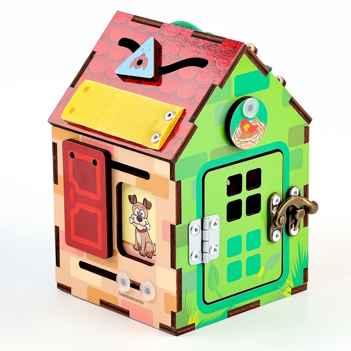 - Включает интерактивные элементы: шестерёнки, шнуровку, липучку и крючки, которые тренируют координацию движений и мелкую моторику.