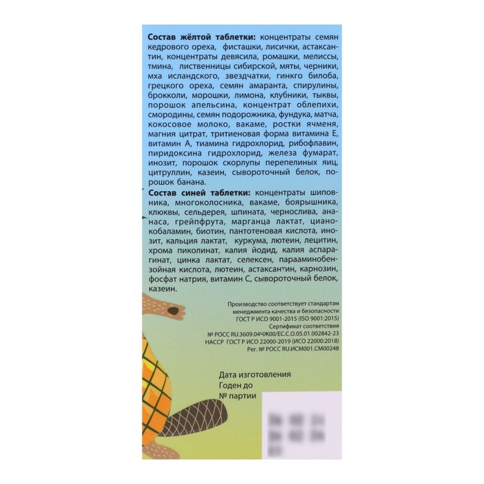 Состав жёлтой таблетки: концентраты семян кедрового ореха, фисташки, лисички, астаксантин, концентраты девясила, ромашки, мелиссы, тмина, лиственницы сибирской, мяты, черники, мха исландского, звездчатки, гинкго билоба, грецкого ореха, семян амаранта, спирулины, брокколи, морошки, лимона, клубники, тыквы, порошок апельсина, концентрат облепихи, смородины, семян подорожника, фундука, матча, кокосовое молоко, вакаме, ростки ячменя, магния цитрат, тритиеновая форма витамина Е, витамин А, тиамина гидрохлорид, рибофлавин, пиридоксина гидрохлорид, железа фумарат, инозит, порошок скорлупы перепелиных яиц, цитруллин, казеин, сывороточный белок, порошок банана.