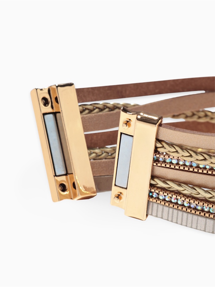 - Стиль и элегантность: прекрасно подобранные оттенки и блестящие вставки из страз и металла придают браслету неповторимый шик.