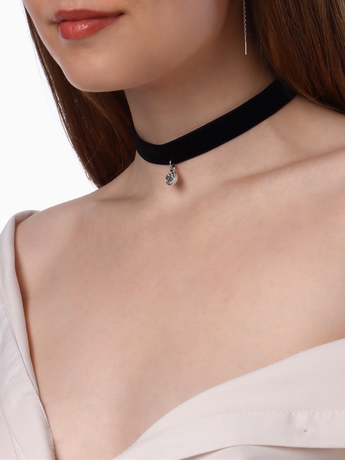 Чокер длиной 33 см представляет собой изящное украшение на текстильной основе чёрного цвета с одной нитью, украшенное круглой вставкой из искусственного фианита в огранке и серебристой металлической фурнитурой. Такой дизайн создаёт эффект лёгкого сияния, подчёркивая утончённость и современный стиль своей обладательницы.