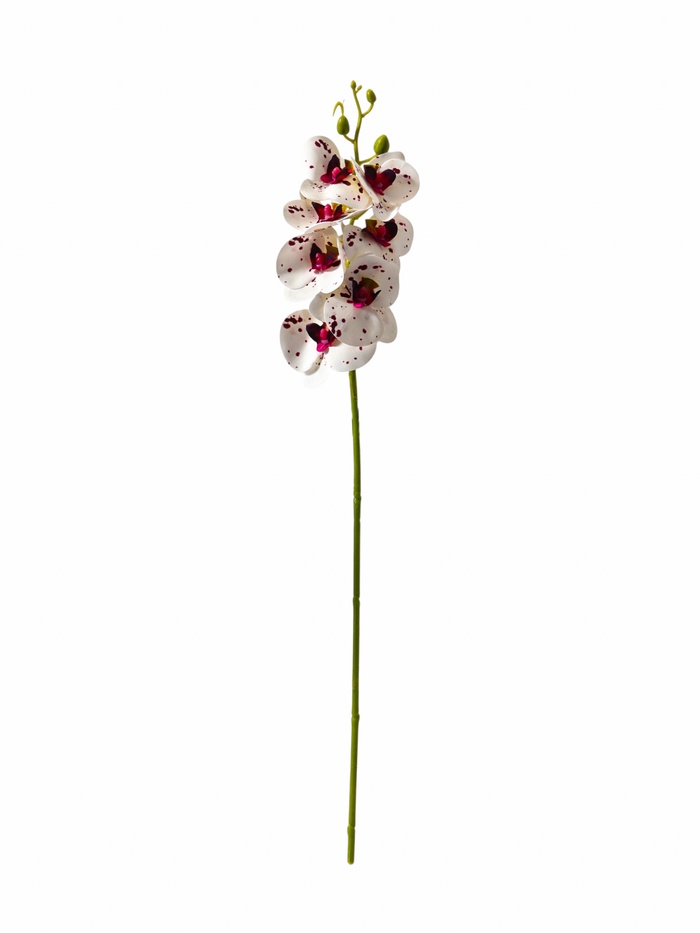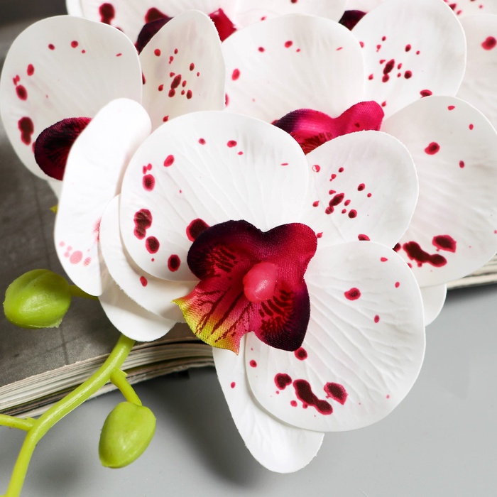 - Высокая детализация и реализм: Каждый лепесток и бутон тщательно проработан. Пластик, имитирующий текстуру живого цветка, передает природную хрупкость и изящество орхидеи. Цветочная композиция выглядит как свежесрезанный стебель.