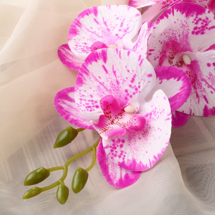 - Безупречная реалистичность: Каждый бархатистый цветок и бутон тщательно проработан. Нежный градиент от малинового к белому и естественная форма лепестков создают эффект только что распустившейся орхидеи. Композиция выглядит живой и свежей.