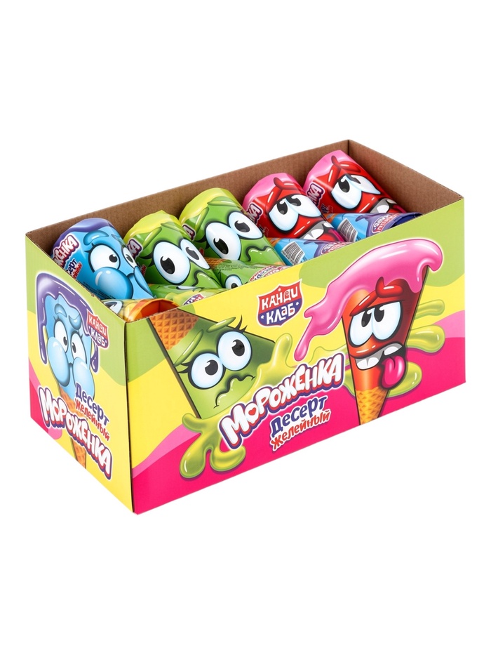 Желейный десерт «Мороженка» в форме миниатюрных рожков и стаканчиков возвращает вкус лета в любое время года. Это ассорти фруктовых желейных конфет в индивидуальной пластиковой упаковке. Нейтральная тематика делает его универсальным угощением для детского праздника, сладкого стола или просто для поднятия настроения. Вес в 45 грамм — это порция для одного или компактное дополнение к основному подарку.