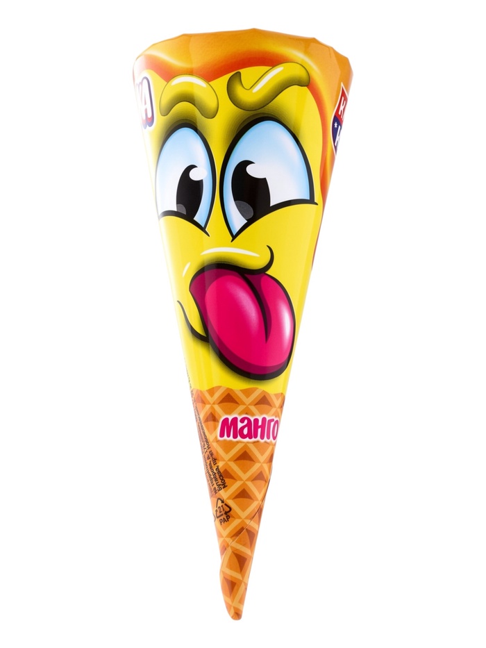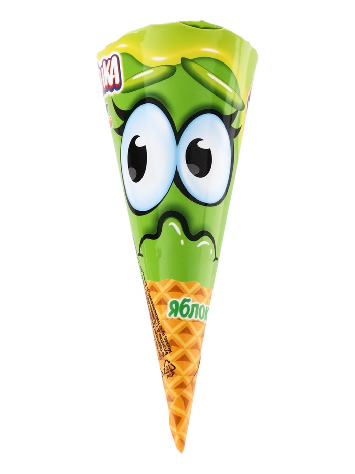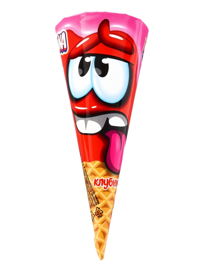 - Конфеты выполнены в узнаваемой форме мороженого — рожки и стаканчики.
