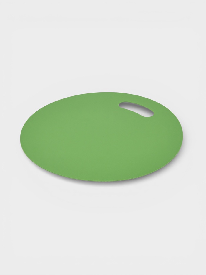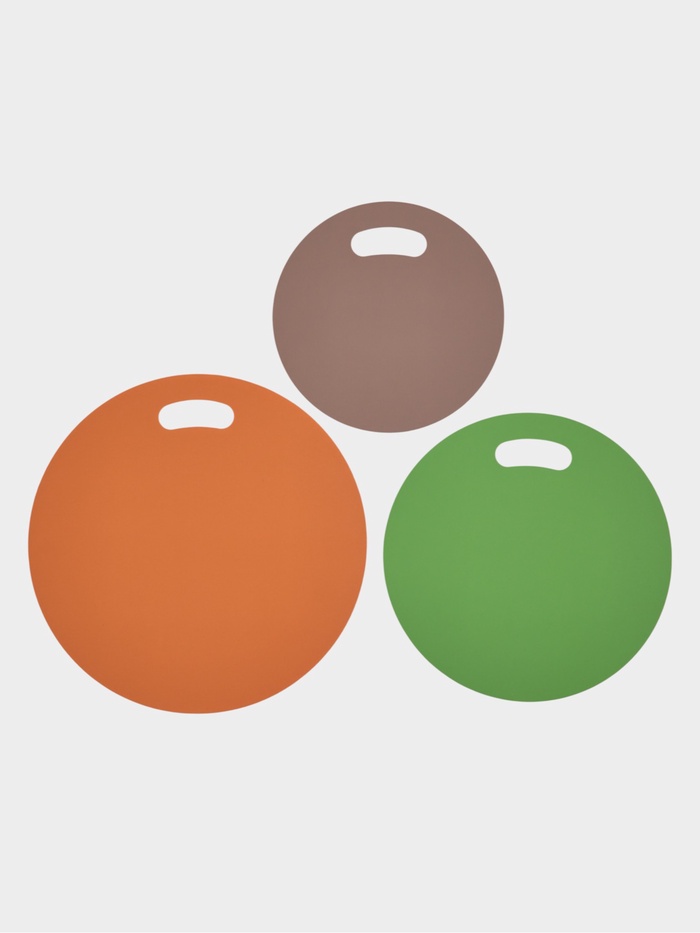 Набор гибких досок упрощает нарезку и пересыпку без лишних движений. Три круглых доски разного размера — от небольшой для лимона до крупной для батона — сгибаются краями, превращаясь в лопатку: нарезали овощи, согнули бортики, высыпали в сковороду. Оранжевая, зелёная и коричневая поверхности помогают разделить продукты по типу — никаких перекрёстных запахов и беготни за новой доской. После работы повесили на крючок у раковины или убрали в узкую щель между полками.