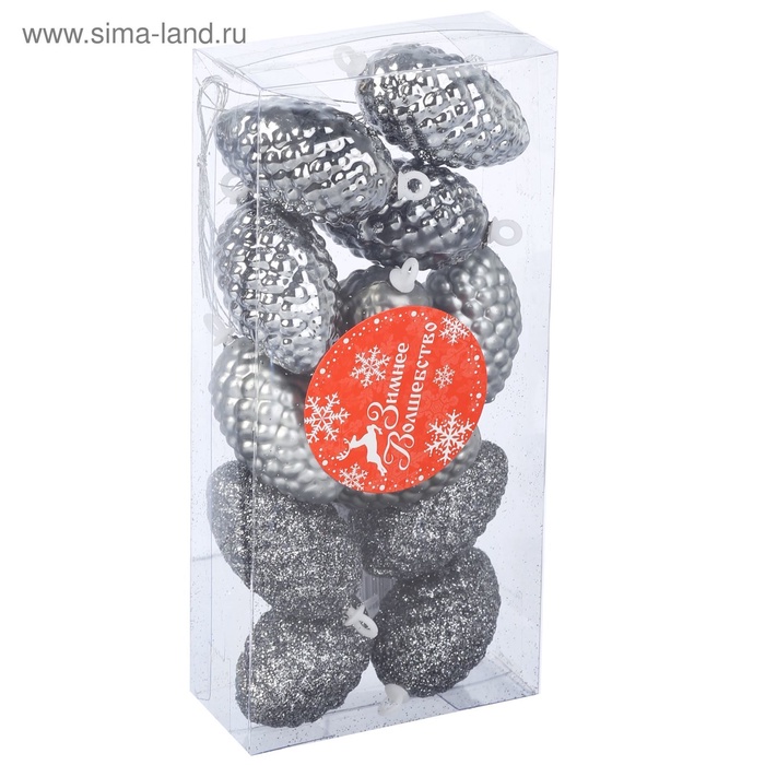 Свет зимнего праздника на кончиках ветвей. Новогодние игрушки «Шишки» — это 12 серебристых украшений, выполненных из прочного пластика. Игрушки в форме шишек добавляют ёлке строгость и сияние, подходя для оформления в скандинавском, датском или ар-деко стиле. Дизайн сочетает минимализм советской эстетики и современную лаконичность, создавая ощущение спокойного торжества.