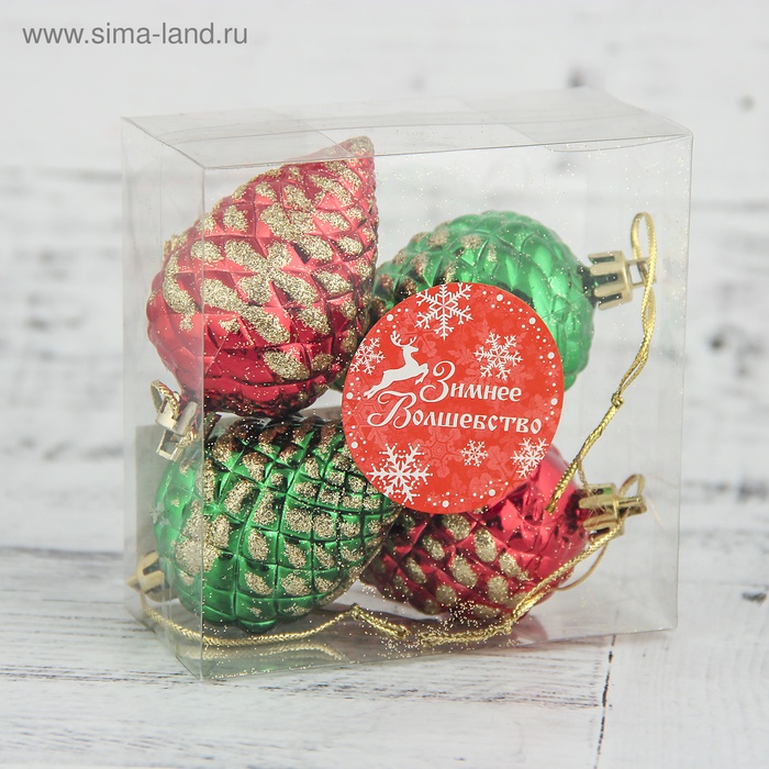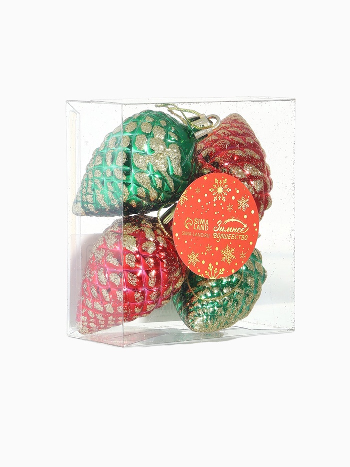 Искры новогоднего очарования на вашей ёлке. Новогодние игрушки «Шишка с золотинкой» — это 4 украшения в ярких красно-зелёных тонах, выполненных из прочного пластика. Игрушки в форме шишек с декоративным рисунком станут заметным акцентом праздничной композиции. Дизайн сочетает элементы новогоднего барокко, скандинавской лаконичности и советского стиля, что делает их универсальными для разных интерьеров.