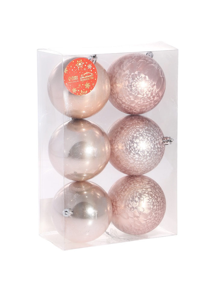 - В комплекте 6 шаров с равномерным однотонным покрытием бежевого оттенка.