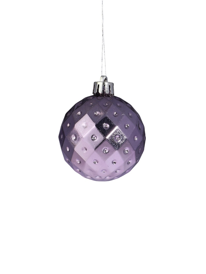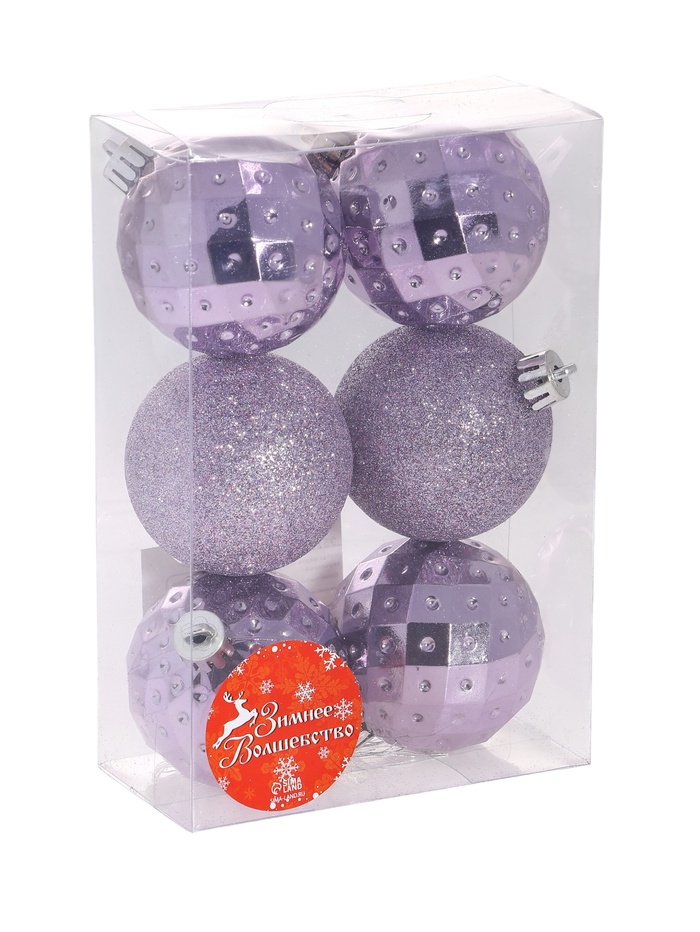 Набор из шести сиреневых ёлочных шаров диаметром 6 см выполнен в стиле шебби-шик с однотонным покрытием. Эти украшения создают мягкую и уютную атмосферу, подчёркивая изящность новогоднего декора.