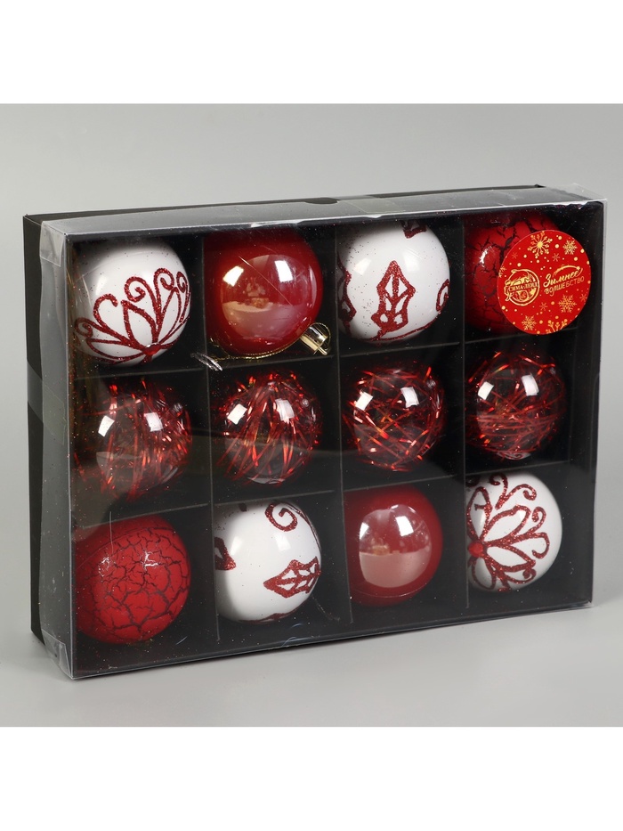 - Комплект из 12 шаров с разнообразным дизайном и наполнением.